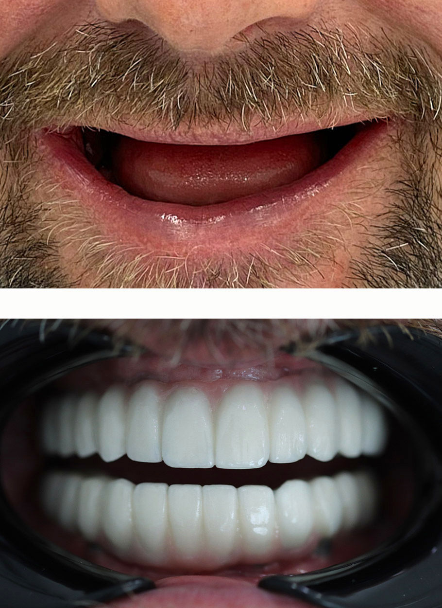 Prostheses screwed onto the implants were installed on 6 upper and lower implants; these prostheses completely restored chewing function and aesthetics, positively restoring his daily life and confidence for everyday activities.